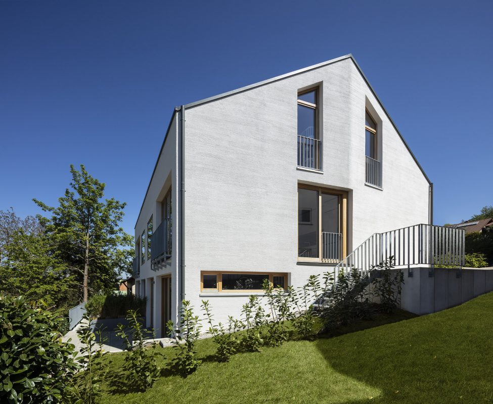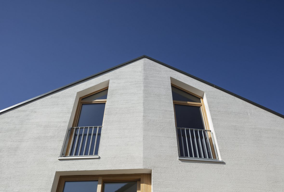 Die Putzfassade ist in einem grob strukturiertem, horizontalem Besenstrichputz ausgeführt, eine Reminiszenz an die zum Teil groben Putzstrukturen aus den 70er Jahren der umgebenden Bebauung. Der gewählte Farbton altweiß der Fassade harmoniert mit den geölten Eichenholzfenstern.